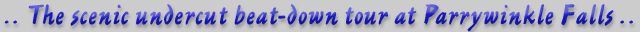Finally Pete found a hiking trail that drops down in about a mile above Parrywinkle Falls. He did the run solo in 2002, and documented it on his online guidebook. During his solo descent he also ran Parrywinkle Falls, which is the first known descent of this large waterfall ( it had been blocked by logs in previous years, which had only recently flushed out ).
