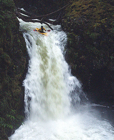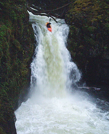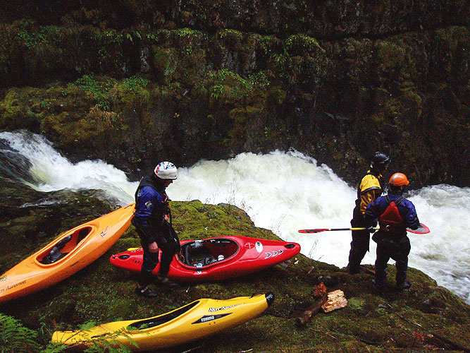 Things got tricky just above the big Falls. You HAVE to catch the eddy on the right, because there is a horrendous class V+ drop leading into the big Falls that no one has ever run. If you miss the eddy.. well, let's not go there.