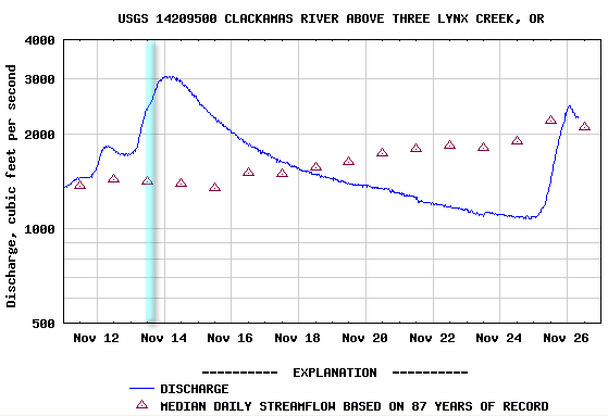 Here is the flows in Clack at 3 Lynx, the vertical blue line marking the time we were on the river:
