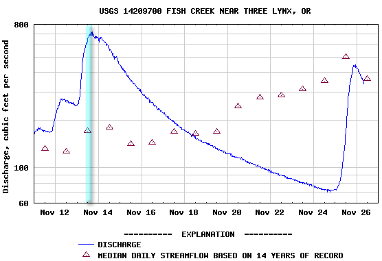 Here is the flows in Fish Creek, the vertical blue line marking the time we were on the river: