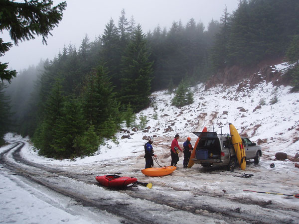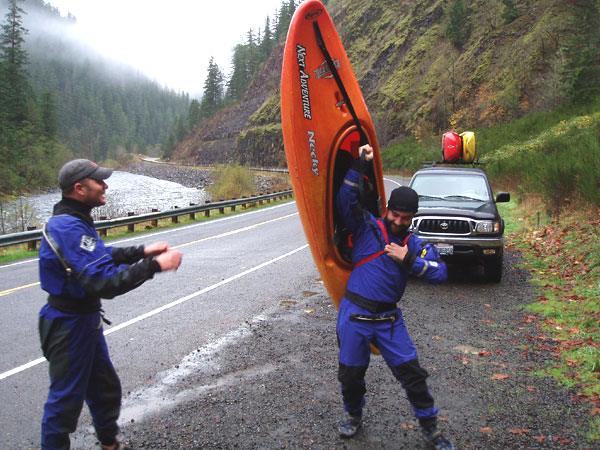 We met at Bob's Hole on the Clackamas early that morning. The hike in is three miles, so at the put-in Charles and Nate hastily tried to rig up kayak back-pack units, which led to some pretty amusing moments..