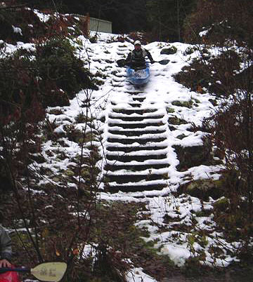 We followed the well defined trail around the dam. Although it looks and probably is runnable, PUD asked us to stay off of it. You can however, slide down the stairs at the end of the portage.