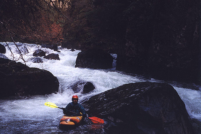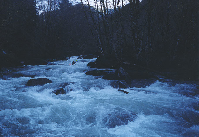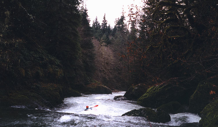 The gradient numbers are deceptive- though the average is 65 fpm the section containing the short gorge is about 120 fpm for a mile. Always scout the boulder garden in the gorge before committing to it, preferably from the road because wood is almost always present in some of the chutes. Warm up at the put in because the river is quite continuous for the first two miles. Some interesting class III whitewater leads to the gorge, just over a mile downstream from the put in. Here the walls close in and the river takes a hard left and plunges through the biggest drop on the river. The hole at the bottom of the main chute isn't the problem; getting to it is the trickiest part. This jumble of boulders may be too shallow to run at lower flows. At higher flows the holes here could become quite challenging, though a sneak route may open on the right.