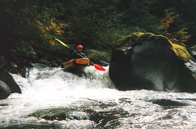 Darkness fell quickly over the mid-October sky. Somehow I became separated from my two comrades as, unbeknownst to me, they had decided to strike out high up for the ridgeline. I stuck close to the creekbed, thinking it would eventually lead me to safety. It was pitch black by about 7PM and, as I stumbled along the creek, I reluctantly resigned myself to spending the night out alone in the Oregon wilderness in my cold wetsuit. Bruised, sore, tired, hungry, and thirsty, I climbed up the bank and in the dark made my very crude campsite besides a fallen pine tree. "OK, at least I have my paddle to use should a cougar or bear decide to attack." I thought. I curled up for the long cold night, trying not to think of what might happen IF that cougar should come.