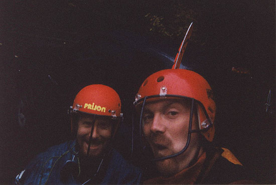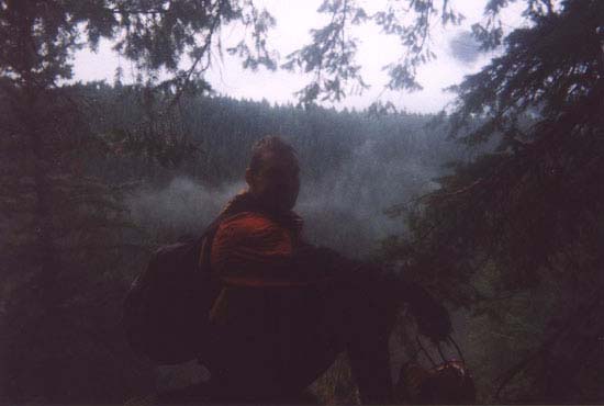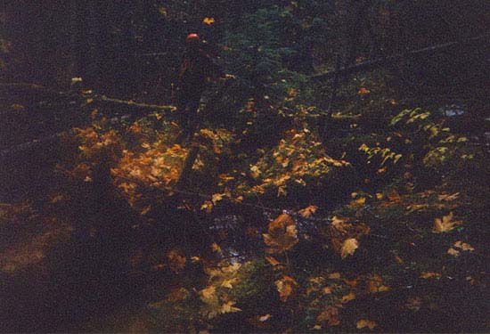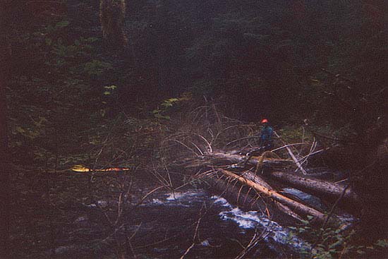 Once it was light enough, Tom and I began the long hike out. At first we headed up above the creek along the side of the canyon. However, the beauty of the thick second growth forest quickly gave way to misery of trudging along thick, wooded undergrowth on a 45-degree incline. Somewhere along the way I stumbled and twisted my ankle, which further exacerbated my misery. We then decided to head back down to the creek. This too proved to be a painful exercise. I fortunately was wearing gloves, but Tom's hands were bare, and he was soon to find more than his share of thorns and stinging nettles. The Devil's Club was particularly horrific in this stretch of creek, and Tom paid dearly. Numerous times we thought that the canyon was opening up, only to go around another bend and realize this was not the case. After 3 or 4 hours of this hell, we were both extremely tired and terribly thirsty. We made the decision to drink the creek water - Ghiardia be damned! I waded out into the creek and plunged my head under the surface of the moving water, taking in mouthfuls of the cold liquid. I vividly remember how wonderfully sweet and fresh the water tasted. Of course, having had only a couple of ounces of All Sport over the previous 18 hours, I imagine cow pasture run-off would have been like Perrier! After drinking our fill, we continued downstream which, as it turned out, was only another 30-45 minutes before Horse Creek joined from the left. At first, I didn't believe Tom when he said that this was it, but sure enough, there was the monster log he had limboed under the week before. We were free!!!