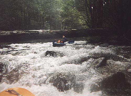 We unpacked our gear, suited up, and set out on the remaining half of the run. Since Dan had run this section two week's before, and we had "scouted" most of it during our hike out, we knew pretty much what we were in for. Again, the run down to Horse Creek went off without a hitch. OK, we had another 6 or 7 portages, but these we insignificant compared to what we had endured earlier. In fact, dare I say that this lower half was actually fun. Although there many logs in the stream, none blocked the real rapids, which were mainly class 3/3+. Only one drop could be called a class 4, but surprisingly we encountered nothing harder.