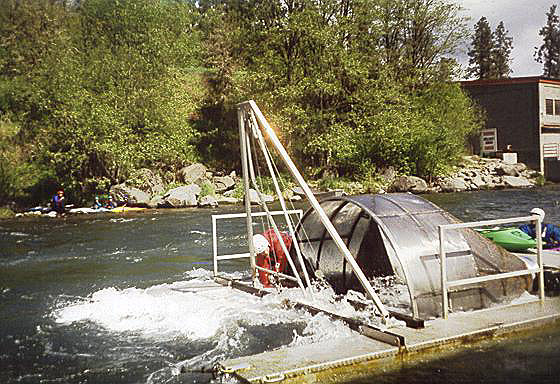 What happened next still chills me. I realized we weren't going to make it to the island with the boat before we reached the fish counter so I shouted to Ray to release the boat. As he attempted to engage his quick release, the boat slid under one of the pontoons of the fish counter. Luckily Ray found his release before he too was swept under the pontoon. The boat was immediately swept into the counter, where it disappeared. We waited for several minutes, but the boat never emerged from the other side. One of the other boaters (Adam) paddled over to the fish counter, pulled his little Eskimo playboat onto the back of the counter and walked on the pontoon to the front to see if he could free the boat. After a quick look we realized it would take a bit more than one person as the boat was pretty solidly wedged in the counter.