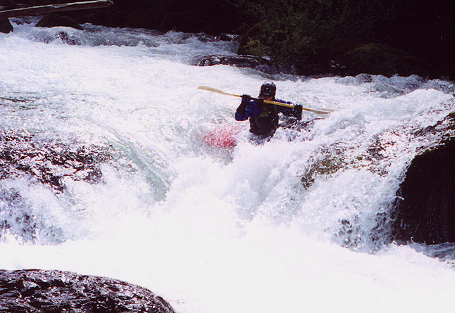 I turned the corner after Whoop-de-Doo and made a half hearted attempt for the next eddy. Needless to say I missed it. I flushed into a line of boulders that block the center of the channel and flipped. The current then drug me, upside down and backwards, over a long chain of boulders. I kept trying to roll only to have my shoulder hit a new boulder each time I set up. I wasn't feeling short of breath, but I wasn't enjoy getting beat over rocks either so I decided to try one more roll attempt before I bailed. Fortunately, no rocks got in the way and I was able to roll up just above the "Silly Putty Slot." I straightened my boat out and bounced down the rocky channel on the left side of the boulder from the slot. I paddled another 20 yards and caught a small eddy on the left to regain my composure. We finished the run with out a hitch and then ran down through the gorge and called it a day.