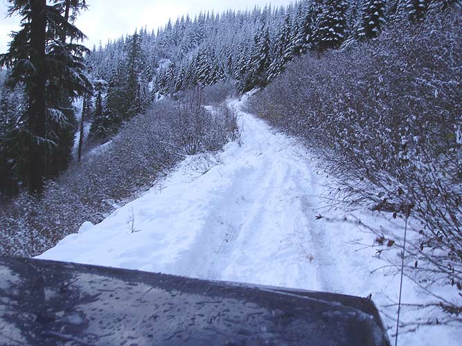 We quickly left the other two trucks behind ( one of which Jon was riding in, at least we hoped he was.. ). As we bounced and fish-tailed our way up the road my body temperature continued to plummet as overhanging branches dumped snow on us and a vicious cross-wind tore through my thin layer of fleece.