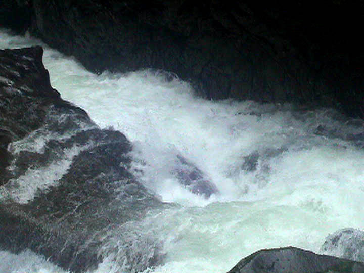 It was very dark and disorienting; I had no idea where I was and the thunder of the river overhead only added to the confusion. I twisted, kicked, pushed and pulled myself along the underside of the boulder, hopefully downstream, I'd had enough of that hole, thank you very much. I had to pull through calm spots twice and I bumped along the bottom a couple of times as well, and each time I pulled my feet up to avoid entrapment.