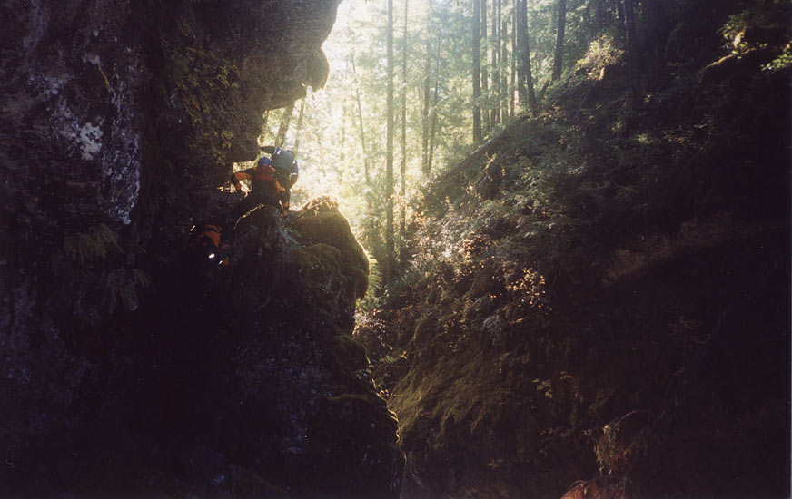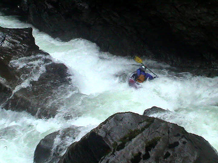 Elbow Room is one of the few gorged-out sections on the Ohane, where a paddler has no options for safety or portaging at river level due to sixty-foot vertical walls on either side of the river. Historically, paddlers have taken out upstream of this drop and hiked up and around the gorge, or you can do a nerve-wracking tightrope traverse along the cliff immediately above Elbow Room.