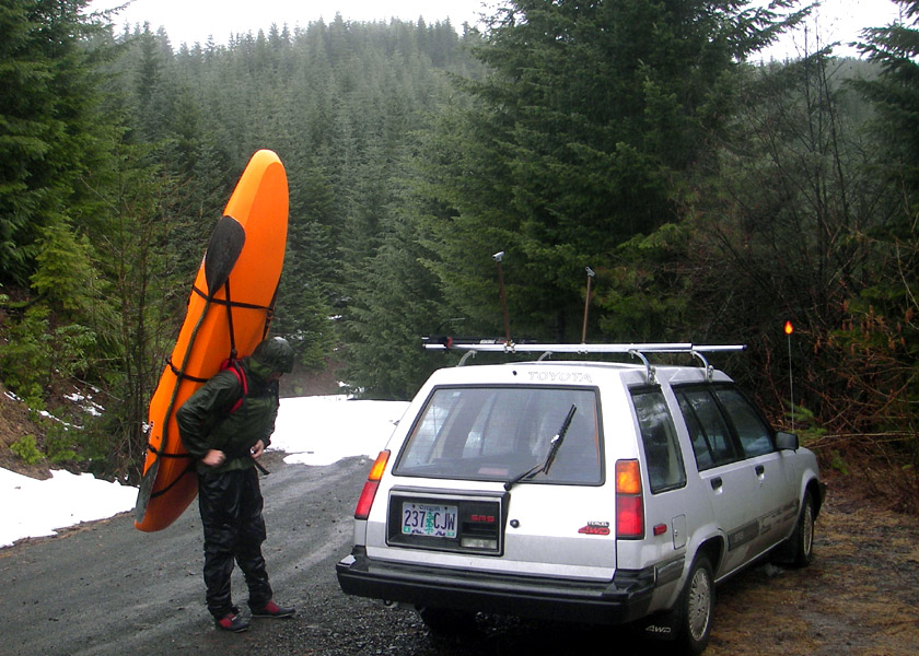 Two friends and I ran our shuttle and were heading to the put in when our one-lane road up a canyon ended in about a foot of thick deep snow heading up the road as far as we could see. It was pouring rain like a Hemingway novel.